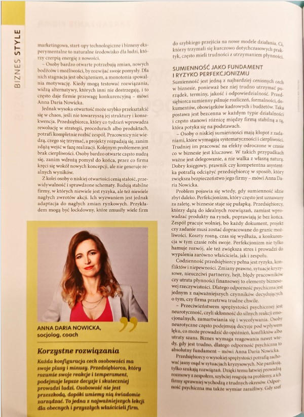 Jak osobowość szefa napędza albo blokuje biznes? To tytuł artykułu Anny Smolińskiej, w którym znajdziesz moje obszerne wypowiedzi. Oto fragment: „Każda konfiguracja cech osobowości ma swoje mocne i słabe strony. Przedsiębiorca, który rozumie własny temperament, łatwiej przewiduje swoje typowe reakcje i dzięki temu unika błędów powtarzanych pod wpływem emocji. Nie chodzi o to, by stać się kimś innym, ale by dowiedzieć, kiedy nasze naturalne tendencje wspierają działanie, a kiedy trzeba je świadomie hamować. Znacznie ważniejsza od posiadania idealnego profilu osobowościowego jest samoświadomość. Właściciel firmy, który zna swoje ograniczenia i potrafi je kompensować zespołem, procedurami i świadomym rozwojem, działa skuteczniej i pewniej. Osobowość nie jest przeszkodą, dopóki umiemy nią zarządzać i świadomie jej używać – mówi Anna Daria Nowicka, socjolog, coach.”
